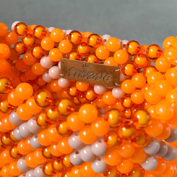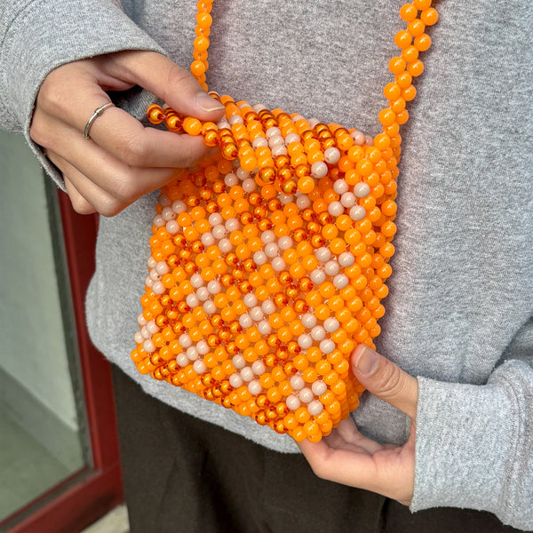ショルダービーズバッグのフタありタイプ。ビーズのみで構成されたギンガムチェックのような柄が特徴的です。不透明ビーズとクリアビーズを併用しています。