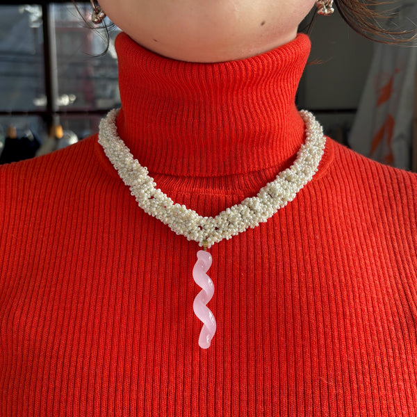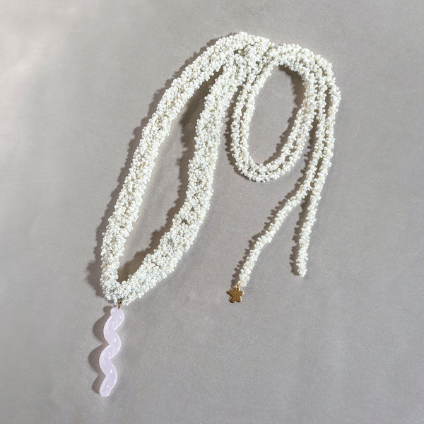 ガラスを使用したアクセサリー。名前の通り、もじゃもじゃとした紐を編み込んでいて、不思議な質感に仕上がっています。