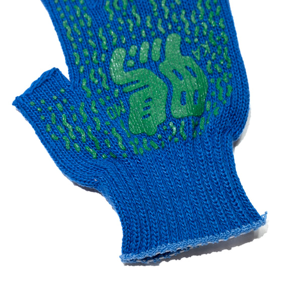 VOU/棒 ORIGINALの指出しタイプの軍手です。右手に「鴨」左手に「川」のグラフィックをシルクスクリーンプリントしました。手首と指の切り口がざっくりとしており、軍手らしくラフに着用できます。ファッションアイテムとしても、作業道具としてもオススメです。