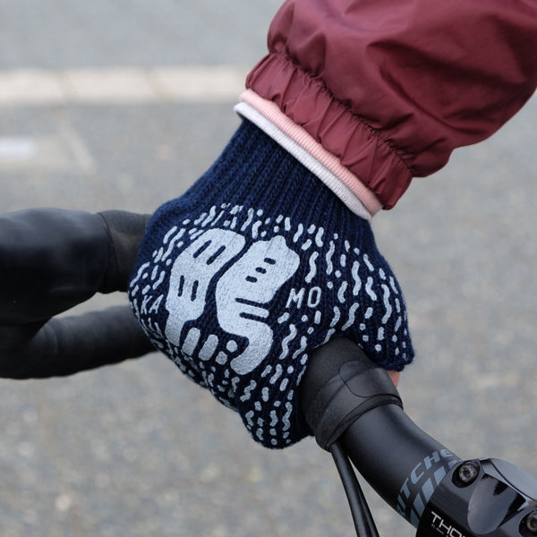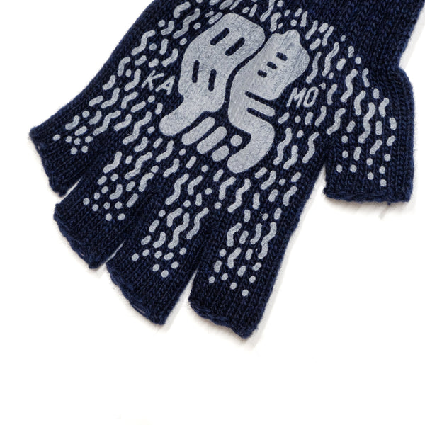 VOU/棒 ORIGINALの指出しタイプの軍手です。右手に「鴨」左手に「川」のグラフィックをシルクスクリーンプリントしました。手首と指の切り口がざっくりとしており、軍手らしくラフに着用できます。ファッションアイテムとしても、作業道具としてもオススメです。