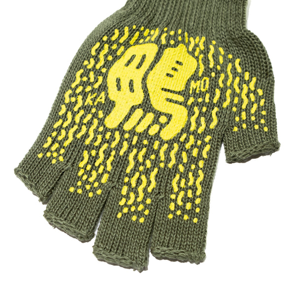 VOU/棒 ORIGINALの指出しタイプの軍手です。右手に「鴨」左手に「川」のグラフィックをシルクスクリーンプリントしました。手首と指の切り口がざっくりとしており、軍手らしくラフに着用できます。ファッションアイテムとしても、作業道具としてもオススメです。