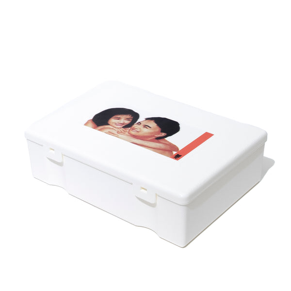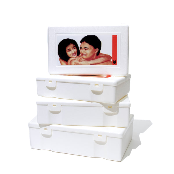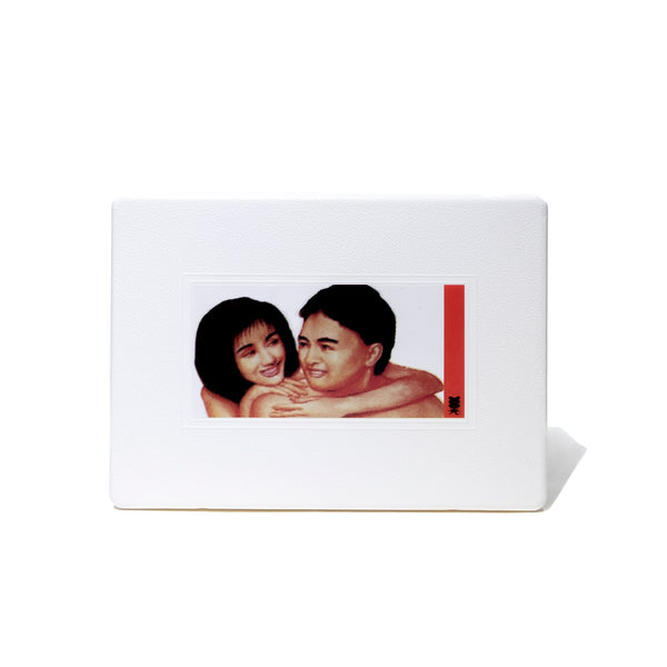 福岡のアーティスト・NONCHELEEEが2017年にVOUに置き忘れてしまった自作コンテナボックスをベースに制作しました。裸で見つめ合う男女の横に、「XO光」を小さく入れています。